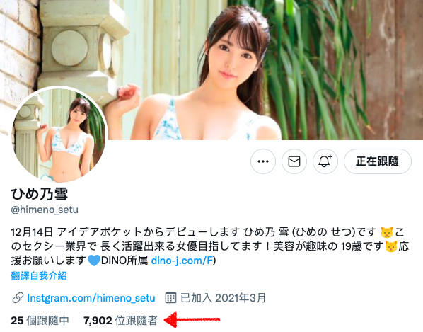 先来解释一下这位新人的艺名,她的姓是「ひめ乃(姬乃)」,名字是「雪」,而且「雪」的读音不是大家熟悉的Yuki而是Setsu,如果有朝一日她来到台湾请大家不要喊错了。而这位新人很早就在社群上现身了,3月,她就有了twitter,在大家推来推去后在正式出道的昨天就已经有接近8000个追踪了⋯