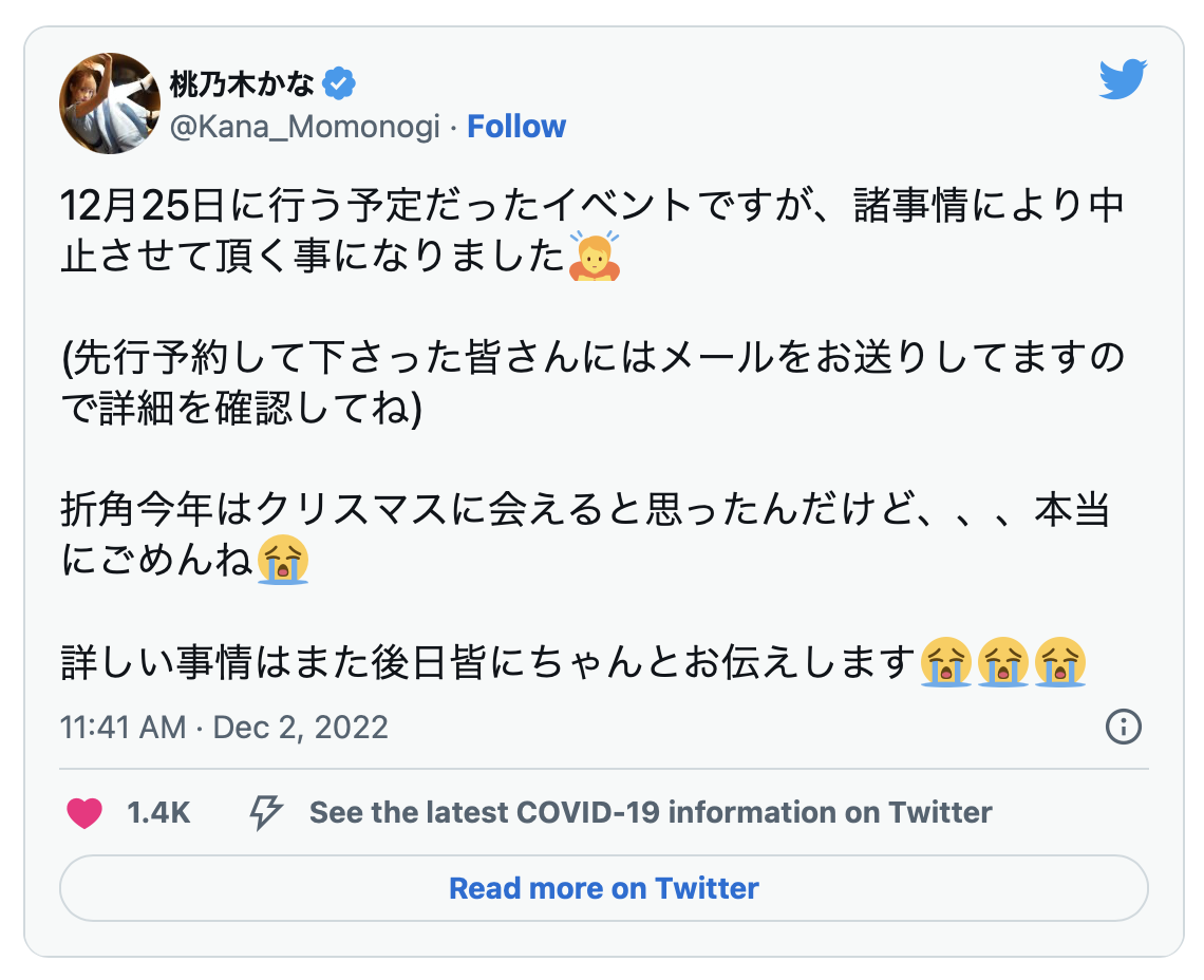 虽然桃乃木かな(桃乃木香奈)不会像小宵和北野一样突然消失,不过12月2号就取消了圣诞节(25号)的活动还是启人疑窦,到底是花生了什么事、让桃乃木かな(桃乃木香奈)必须取消三个礼拜后的活动?